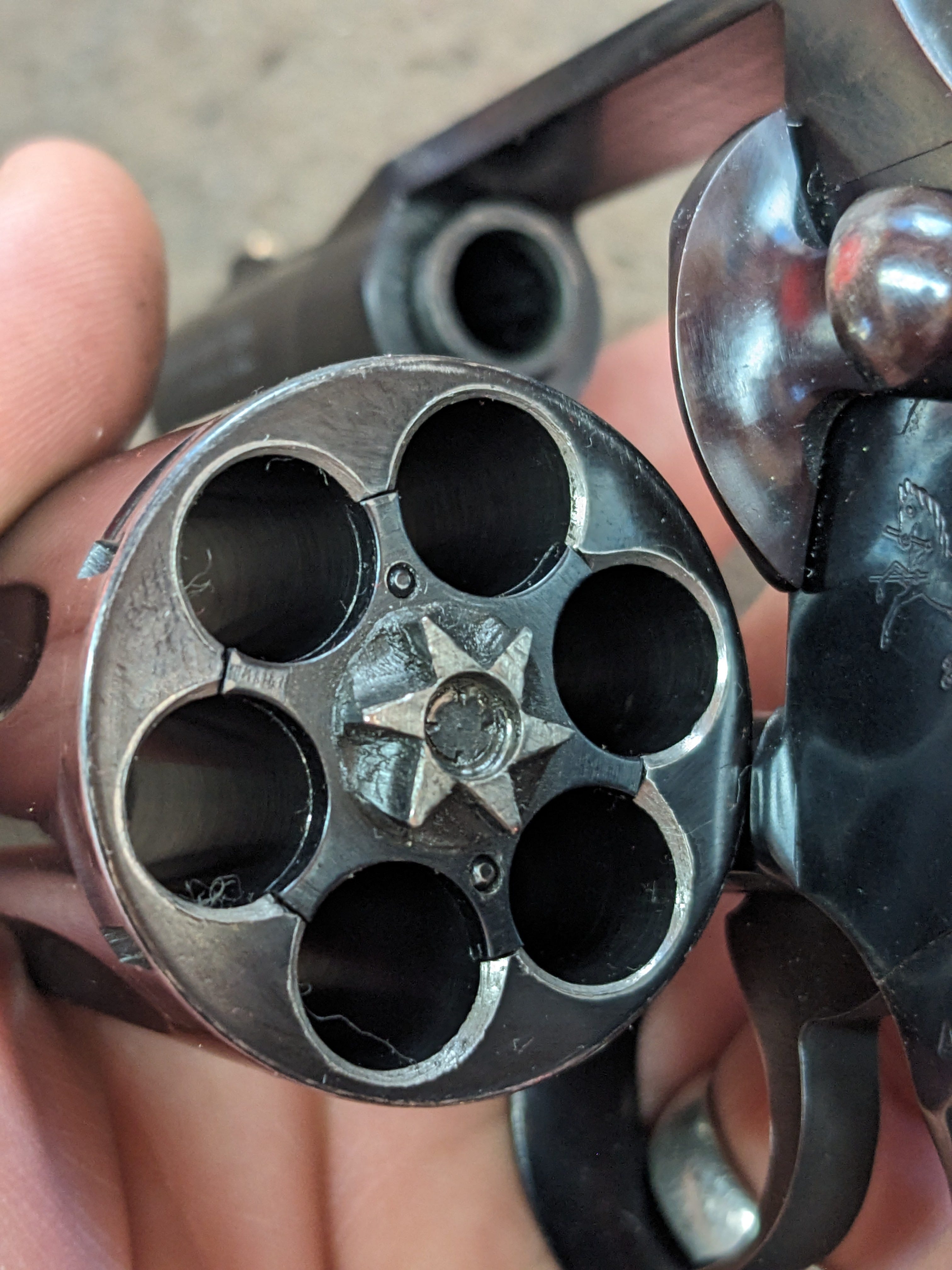 The next job my customer requested was chamfered charge holes. This modification facilitates reloading the gun, making it significantly easier to insert a speed loader into the weapon. I have seen this modification done improperly many times. Just the cylinder should be chamfered, not the extractor star. Chamfering the extractor star increases the likelihood of the extractor slipping past a shell and jamming the gun. Not something we want to risk on a defensive weapon.