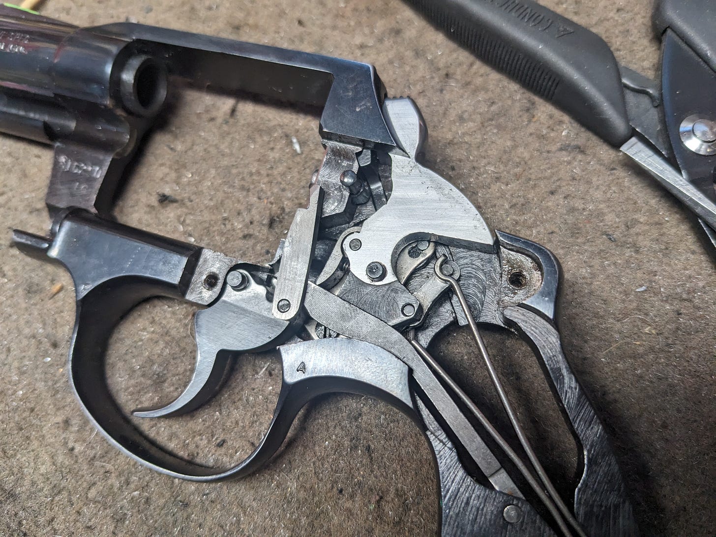 Every job that comes into my shop begins with a thorough teardown and cleaning. This gun was quite clean for its age. I started with an action job. Colts are much more complex than Smith & Wesson revolvers; that being said, they were also very well made with a lot of hand fitting. In the case of a Colt, I can’t install lighter springs like I can in a Smith, since Colts use a single flat spring to run everything, whereas Smiths use several coil springs. There are no aftermarket spring kits for a Colt that I know of. The flat spring could be lightened by making it narrower, but that would ultimately impact its service life, and in the case of a defensive gun, I feel the risk is not worth the reward. I polished everything with a mating surface; the result was a smooth double-action trigger pull that dropped from 10 to 9 pounds. I also mirror-polished the trigger; this does nothing for the action, but it does help the shooter when running the gun in double-action mode. If you have never compared the double-action on a Colt to that of a Smith, then I suggest you try it. They are quite distinct from one another. The Colt has considerably less stack for a consistent straight back pull. I still prefer the Smith action, but that probably has a lot more to do with familiarity than anything else.